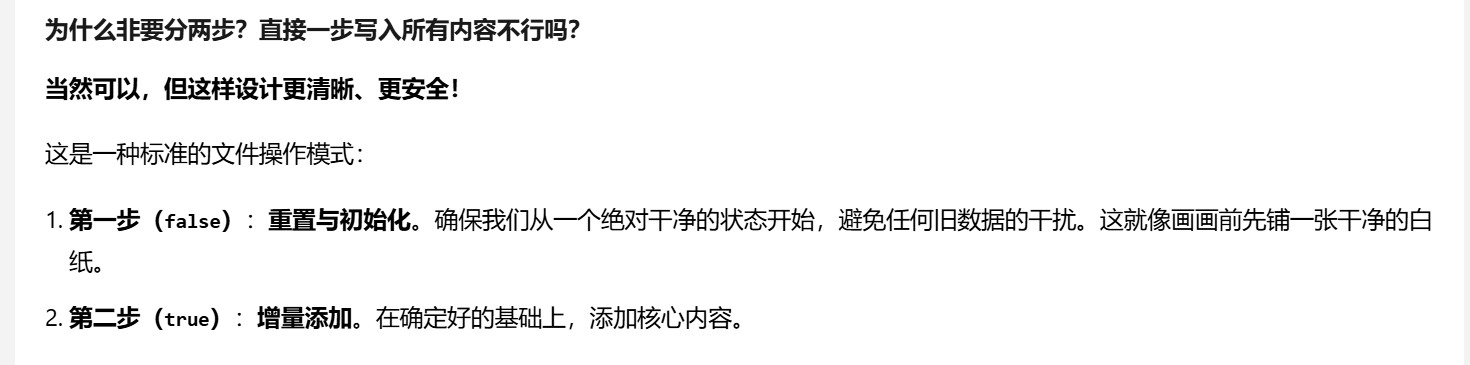 //的作用是向指定文件写入一行文本,并且由于第三个参数是 false,它会清空目标文件的原有内容。