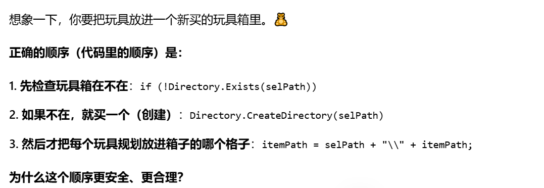 为什么if (!Directory.Exists(selPath))//检查传入的路径字符串 selPath所指向的目录在磁盘上是否真实存在
