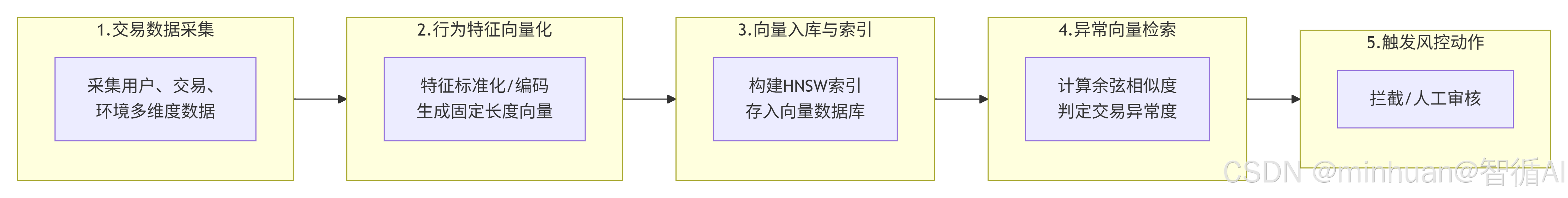 基于向量数据库的实时交易反欺诈系统,整体流程可分为四个核心步骤,我们用流程图清晰展示:
