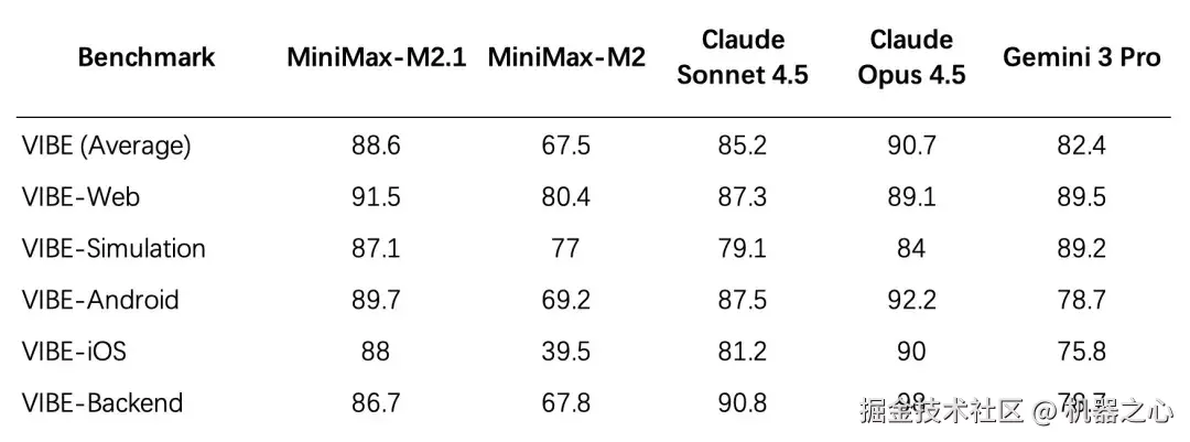 不仅如此,为了给这种「从零到一」的全栈能力提供硬核支撑,MiniMax 还构建并开源了全新基准 VIBE(Visual & Interactive Benchmark for Execution in Application Development)。不同于传统基准,VIBE 涵盖了 Web、仿真、Android、iOS 及后端五大核心子集,并引入创新的 Agent-as-a-Verifier (AaaV) 范式,能够自动评估生成的 Application 在真实运行环境中的交互逻辑与视觉美感。在这场「全栈构建」的终极测试中,M2.1 以平均 88.6 分的成绩展现了卓越实力,不仅在几乎所有子集上显著优于 Claude Sonnet 4.5,更逼近了 Claude Opus 4.5 的水准。