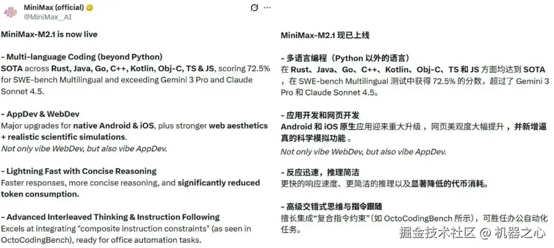 资本市场的喧嚣还没结束,23 日,MiniMax 又反手甩出了一张技术牌:正式上线 MiniMax M2.1 模型。