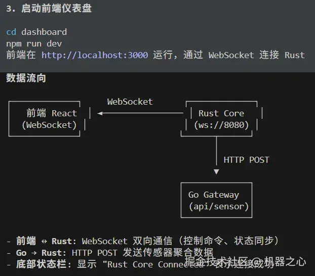 左侧为 React 前端,右上为 Go 语言写的网关,右下为 Rust 写的核心程序