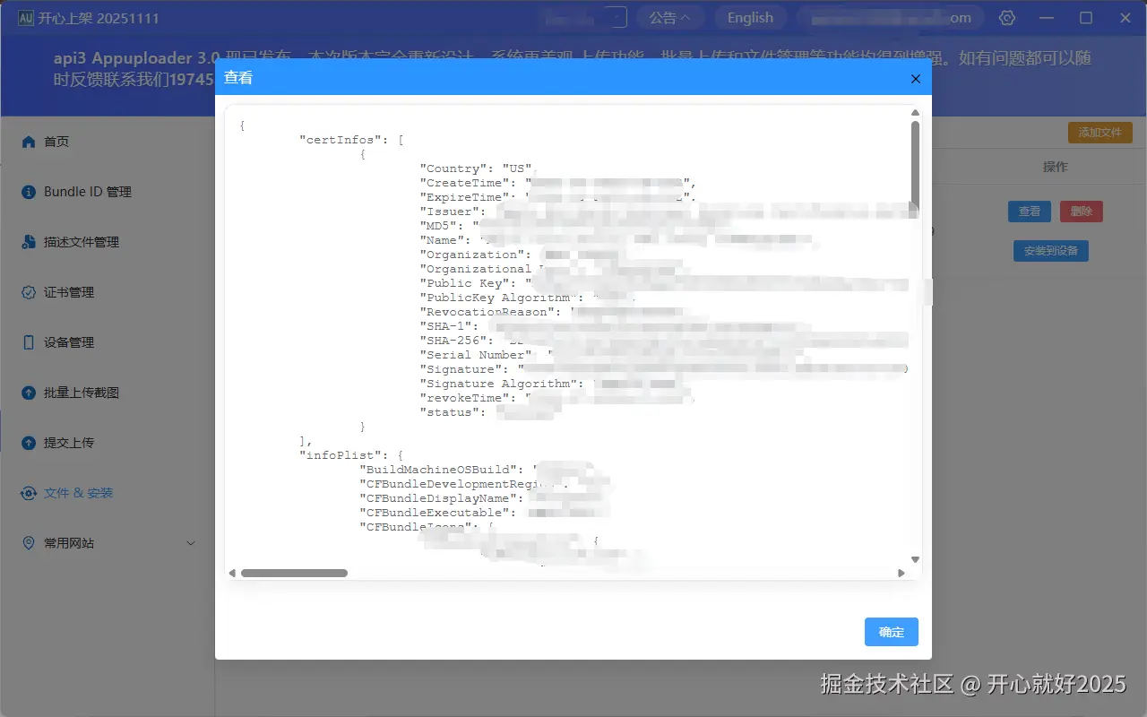 在上架前,我更倾向于直接查看描述文件本身。 通过 开心上架(Appuploader)查看 mobileprovision 文件内容,可以明确看到描述文件类型、绑定关系以及使用的证书是否符合当前阶段需求。