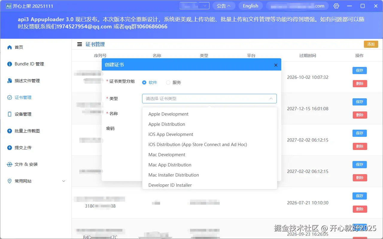 在一些跨平台或多人协作的项目中,我们会通过 开心上架(Appuploader)创建 iOS 证书,生成可复用的 .p12 文件,用于构建和发布流程。