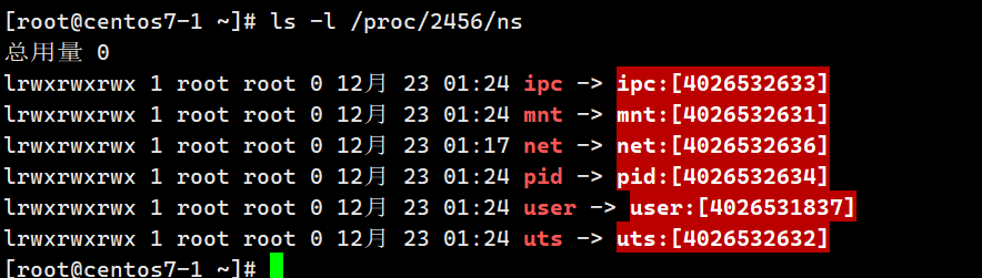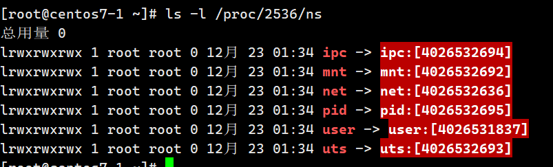 3、查看容器的进程、网络、文件系统等命名空间编号。