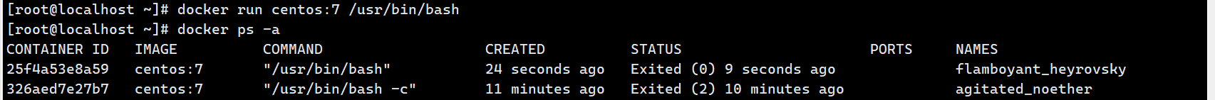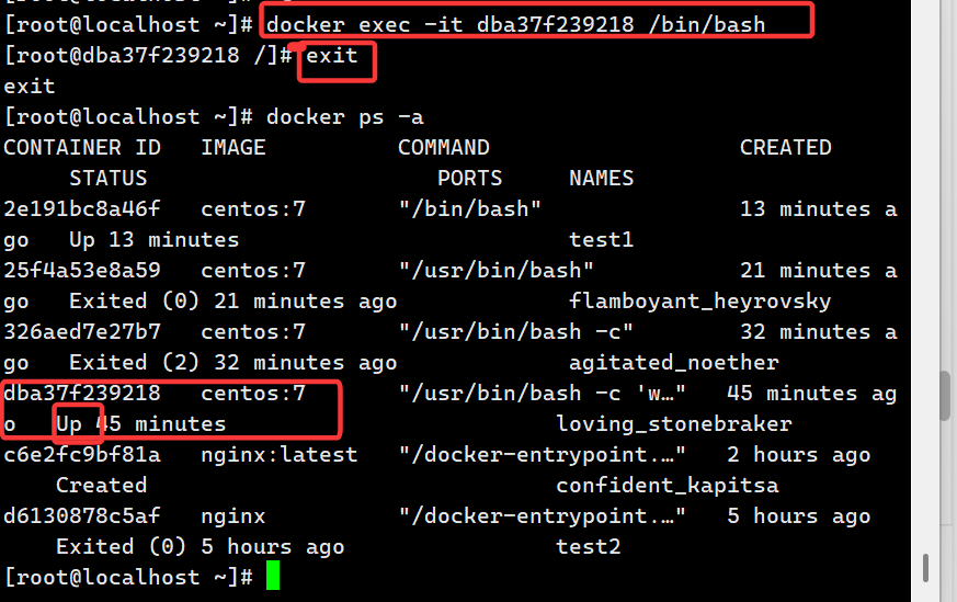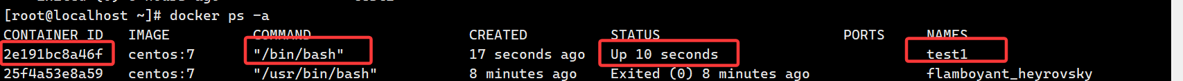 docker run -itd --name test1 centos:7 /bin/bash #创建容器并持续运行容器