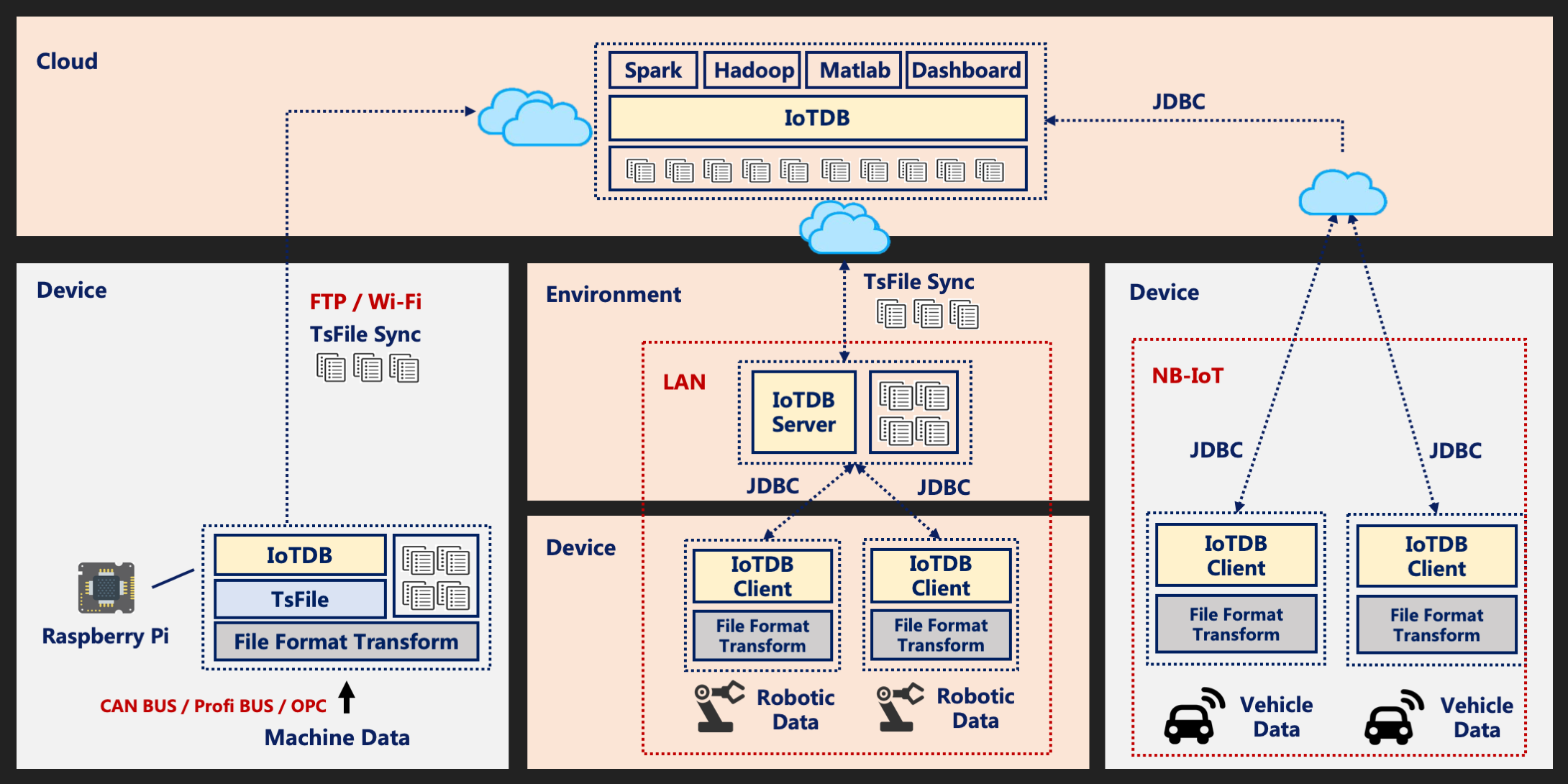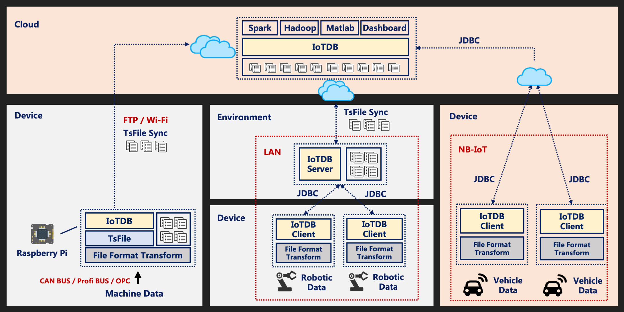 Apache IoTDB采用轻量化架构设计 ,单机版可以运行在边缘网关等资源受限设备上,分布式集群版支持水平扩展到数百个节点。其7×24小时高可用架构保证一个物理节点宕机或网络故障时,系统仍能正常运行。同时,IoTDB提供高效的边云数据同步工具,实现端边云数据的无缝流转。