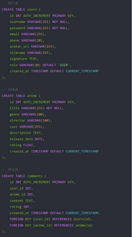 MySQL:关系型数据库,用于存储用户信息、动漫资源、评论等。