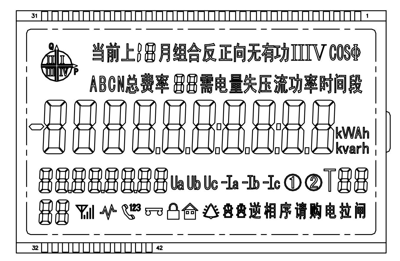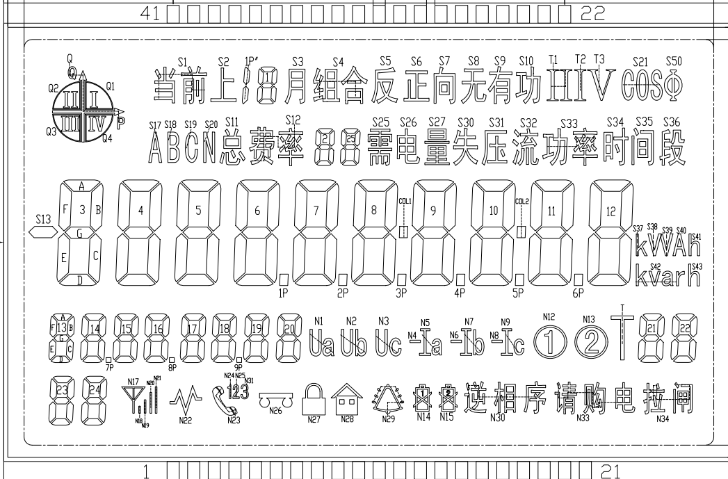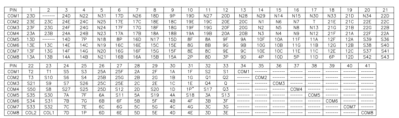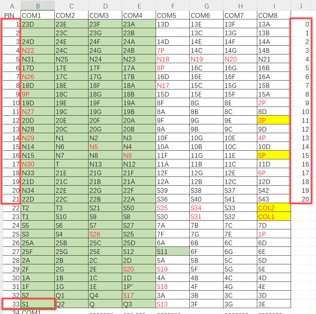 在Excel类型的真值表里,通过查找操作,用户可以很轻松的找到"当前" 对应的字符位置------第33行第1列。我之前是使用长度为34的无符号8位整型(UINT8)数组g_disBuf[]来控制引脚电平,g_disBuf[33] |= 0x80 ,即是将COM1,SEG33引脚设置为高电平,控制屏幕显示"当前"二字(注意:竖列,COM1~COM8的电平与UINT8数据的最高位到最低位bit数据对应,横行,我做的行号标识与要操作的数组元素的数据对应)。LCD厂商做的真值表,通常会将大部分字符放在相邻区域,方便开发者查找。但如果BL55080芯片引脚与LCD的引脚对应关系不友好,开发就需要自己调整行、列数据的显示顺序。之前的PCB设计师,工作经验丰富,引脚大多一一对应,给开发带来了很大帮助。处于某些原因,SEG21号引脚空了出来,所以g_disBuf[21]无需用户操作。