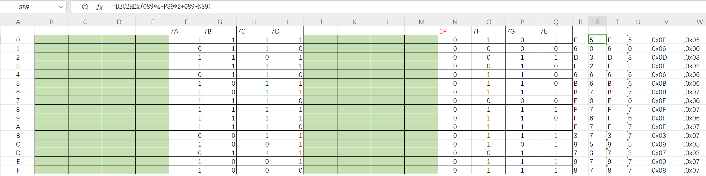 单个显示元素的操作,开发者可以毫不费力的计算出对应的数据,那多个呢?例如,控制中间大数码管,最左边第一个数码管显示4,你还可以计算出来吗,如果把0~0xF对应的符号分别显示出来呢?这个时候我就不建议开发者自己计算,百密一疏,容易出错。我一开始就是这样做的,功倍事半,后来我就使用Excel公式自动计算对应的UINT8类型数据,并对数据进行格式化处理,方便构建数字显示数组。