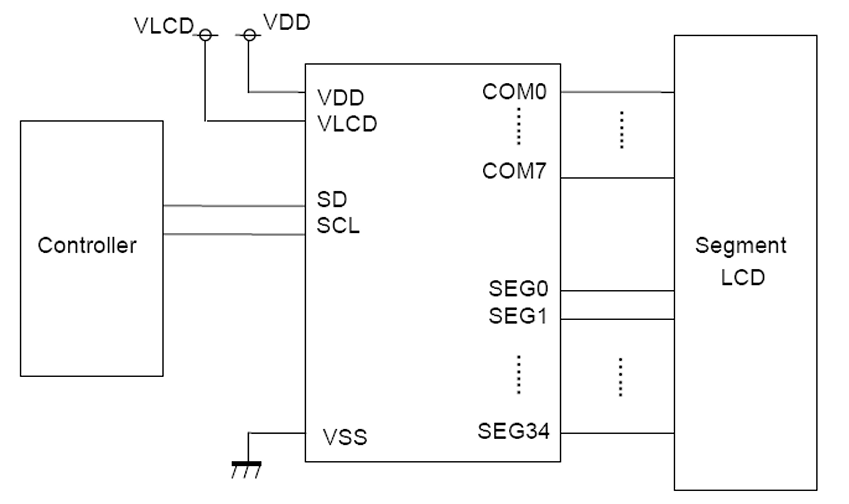 BL55080的典型应用示意图如下所示。"BL55080 内部集成了 LCD 驱动器所必需的所有功能电路。例如:LCD偏置电压发生器、LCD电压选择器、内部时钟(OSC =25.6KHz)、显示寄存器、段/背极输出电路、I2C串行接口、上电复位电路和显示控制电路。BL55080 有35个段输出SEG0--SEG34和8个背极输出COM0---COM7,它们和LCD 直接相连,当少于35个段输出应用时,不用的段可空出。BL55080采用1/8背极输出1/4 偏置电压显示方式。"这是BL55080芯片手册的原文,这里的背指的就是COM引脚,段指的就是SEG引脚。手册里面还提到VDD和VLCD引脚需要同时上电、同时掉电,且VDD的上升时间必须大于1ms。