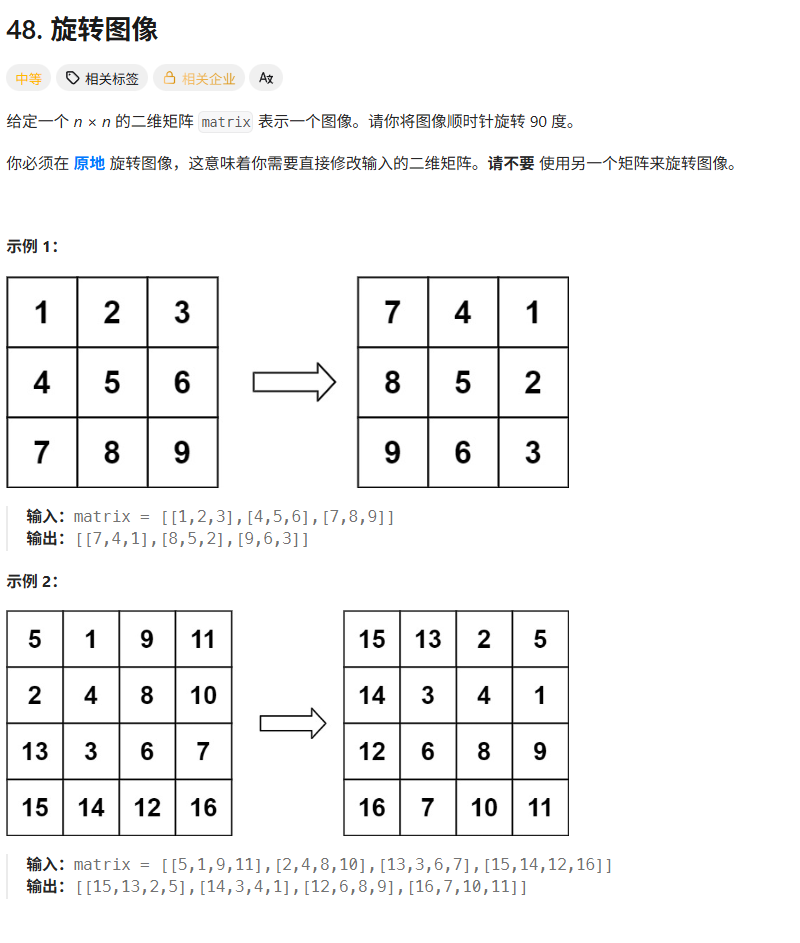 你必须在 原地 旋转图像,这意味着你需要直接修改输入的二维矩阵。请不要 使用另一个矩阵来旋转图像。