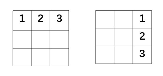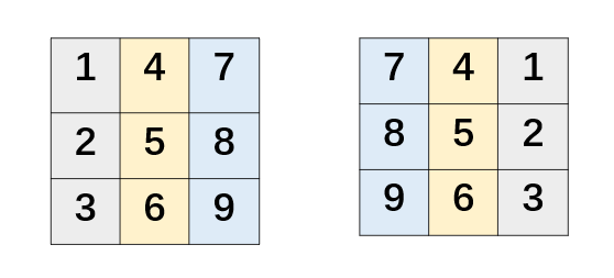 转置之后左边变成了右边,转置后再对比下这个矩阵和我们最终要生成的矩阵。转置能做到的是:(i, j) → (j, i),也就是说:最上面一行 → 最左边一列,但我们要做的是最上面一行 → 最右边一列。直观对比两个矩阵就能发现,每一行的元素的方向不对,反了。