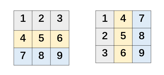 可以得到一个思路,原来横着数的关系,变成了竖着数的关系。从而可以联想到也许可以考虑先把行和列互换,而矩阵中行和列互换的操作就是转置。转置后先看一下:
