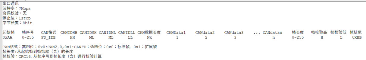 起始帧 帧序号 CAN格式 CANIDHH CANIDMH CANIDML CANIDLL CAN数据长度 CANData1 CANdata2 CANdata3 ... CANdatan 帧长度 帧校验高 帧检验低 帧结尾