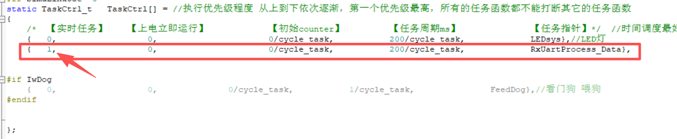 static TaskCtrl_t TaskCtrl[] = //执行优先级程度 从上到下依次逐渐,第一个优先级最高,所有的任务函数都不能打断其它的任务函数