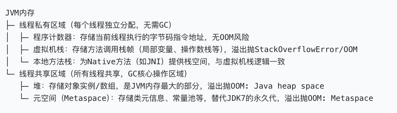 - 溢出类型:不同区域溢出表现不同(堆→OOM,栈→StackOverflowError,元空间→Metaspace OOM);