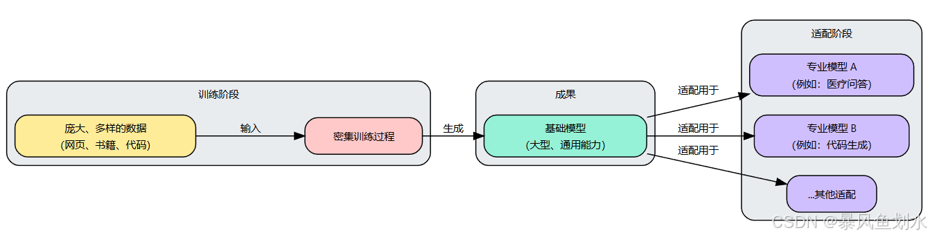 - 作为基础: 基础模型作为基础或起点。其他更专业化的模型通常是通过使用一个预训练的基础模型,并将其调整以适应特定任务或使用场景来创建的。这个过程通常被称为微调。