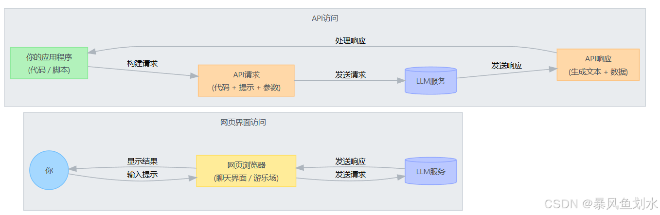 访问和使用LLM主要有两种方法:基于网络的界面和应用程序编程接口(API),示意图如下。