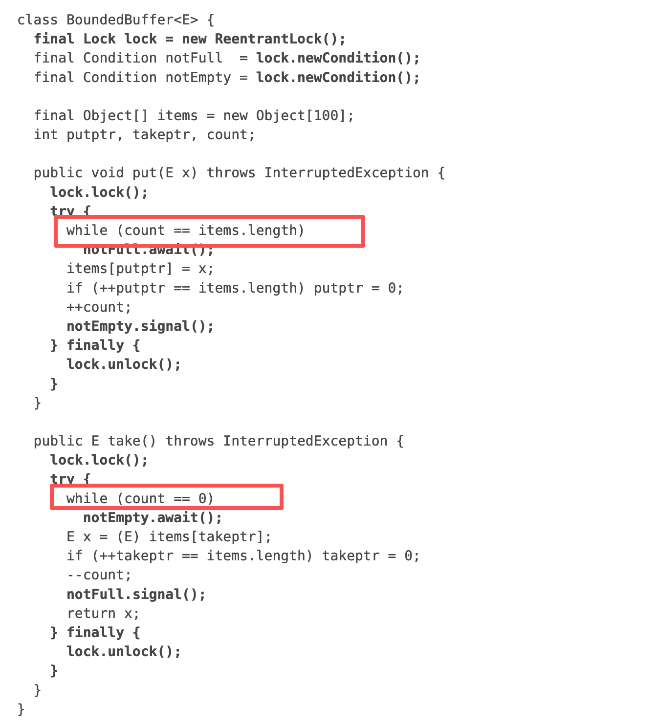 lock或某个condition重新赋值成别的对象,代码会变得非常危险(甚至直接抛异常,比如没持有正确的锁就await/signal会IllegalMonitorStateException)。依赖注入/锁/条件队列这种基础设施通常都应该是 final