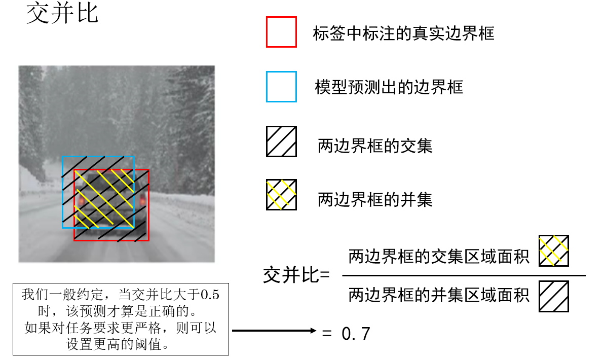 因此,交并比就是我们针对目标检测任务而定义的评估指标,它的字面意思是"交集面积除以并集面积",用于衡量两个边界框的重叠程度 。