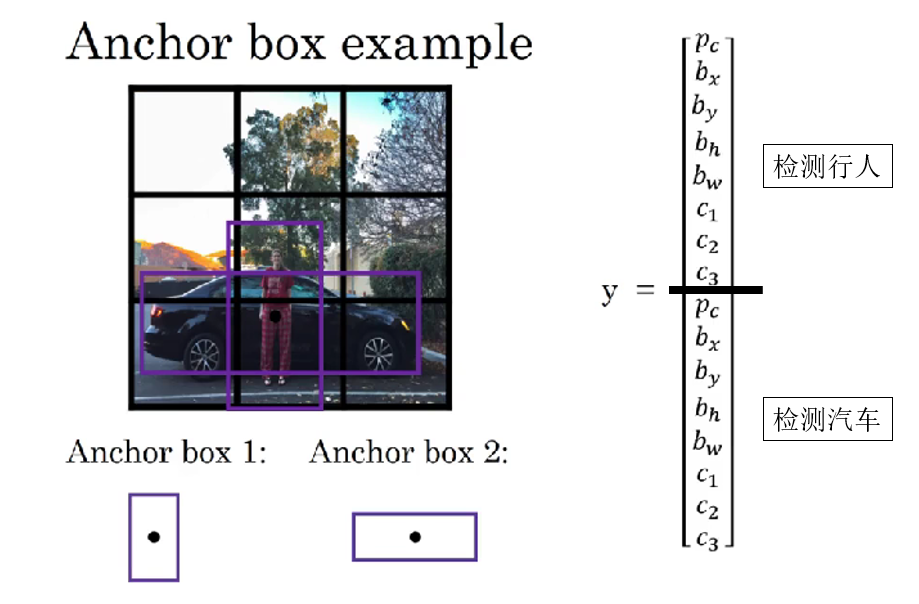 但很显然,当一个网格中可能出现多个目标时,一组标签是不够用的。如果网格里同时出现了行人和汽车,我们就要为它们各自设置一组标签来让网络学习。
