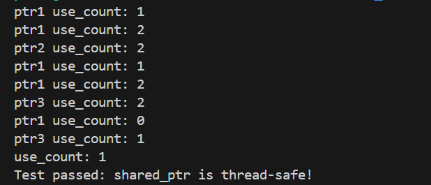 std::cout << "Test passed: shared_ptr is thread-safe!" << std::endl;