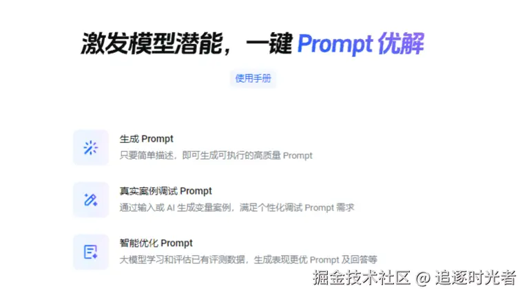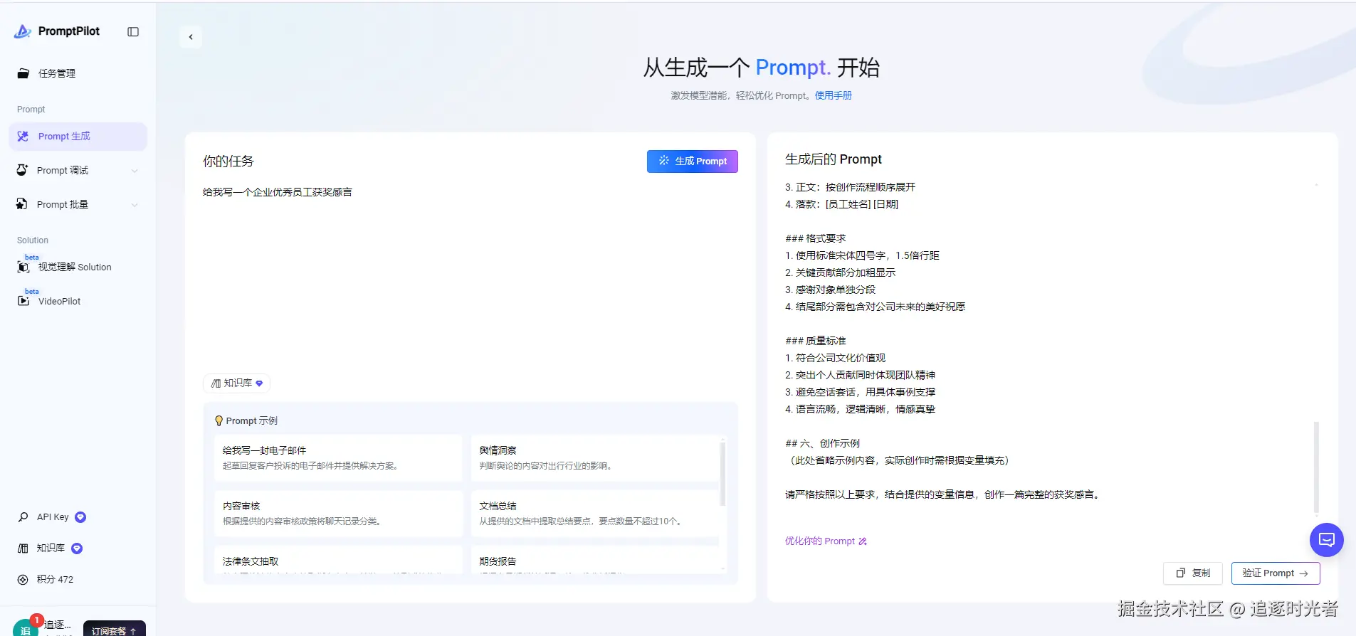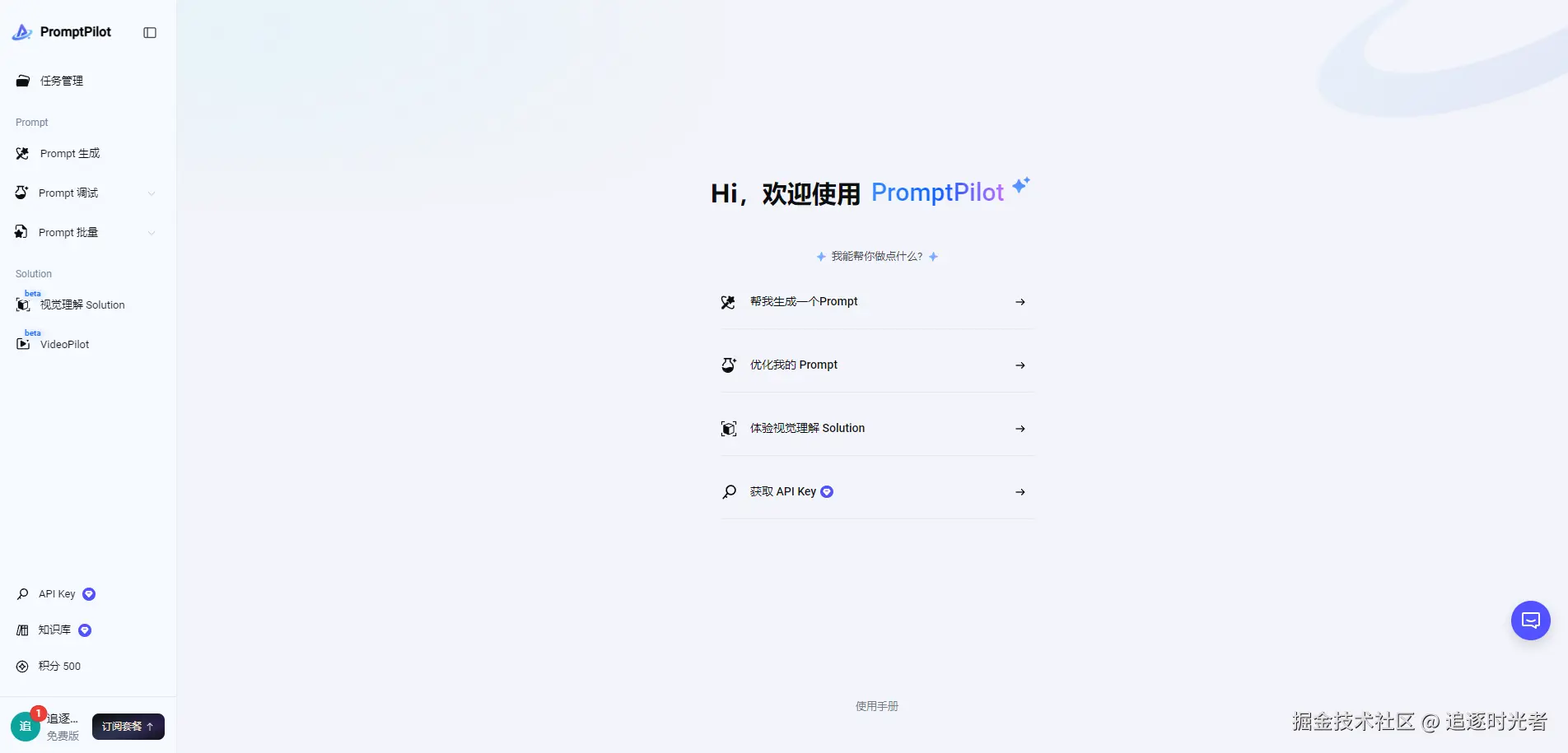 PromptPilot 是由字节跳动推出的一款专注于 AI 提示词优化与提示词生成的实用工具。该工具旨在帮助用户更高效地生成和优化 AI 提示词,提升与 AI 模型的交互效率和质量。通过 PromptPilot,用户可以轻松地创建、调试和管理提示词,以满足多样化的应用场景需求。
