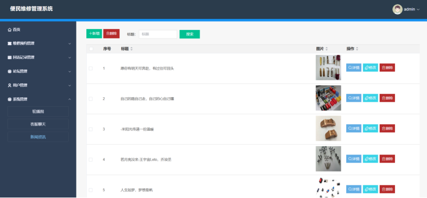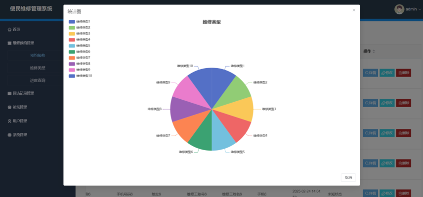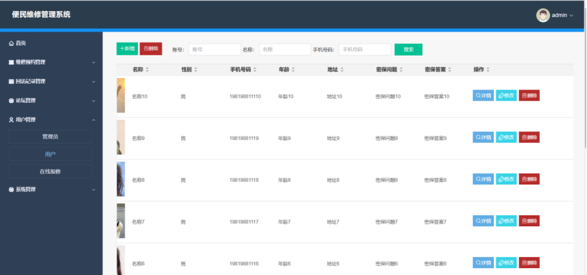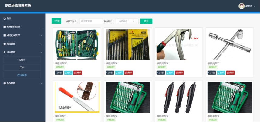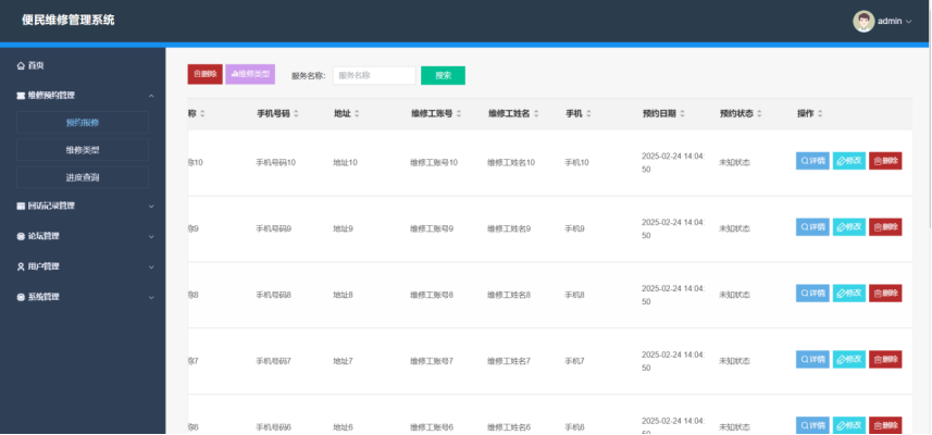 后台:管理员:维修预约管理(预约报修、维修类型、进度查询)、回访记录管理、论坛管理、用户管理(管理员、用户、维修人员)、系统管理(轮播图、客服聊天、新闻资讯)