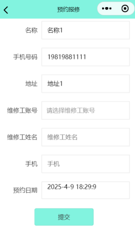 维修员:登录注册、论坛交流、在线报修、维修预约管理、回访记录、客服聊天、修改密码