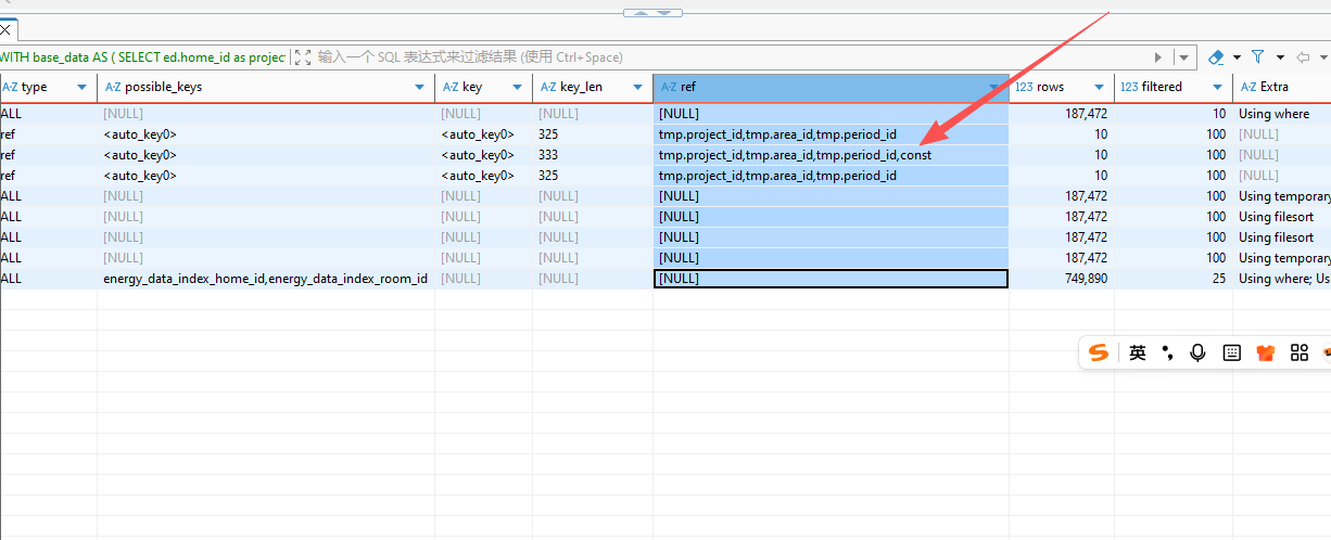 (1) 如果是常量等值查询,则显示为const。 (2) 如果是连接查询,则被驱动表的该字段会显示驱动表的所关联字段。 (3) 如果条件当中使用函数表达式,或者值导致条件字段发生隐式转换,则为func。 (4) 如果没有索引,则为null。