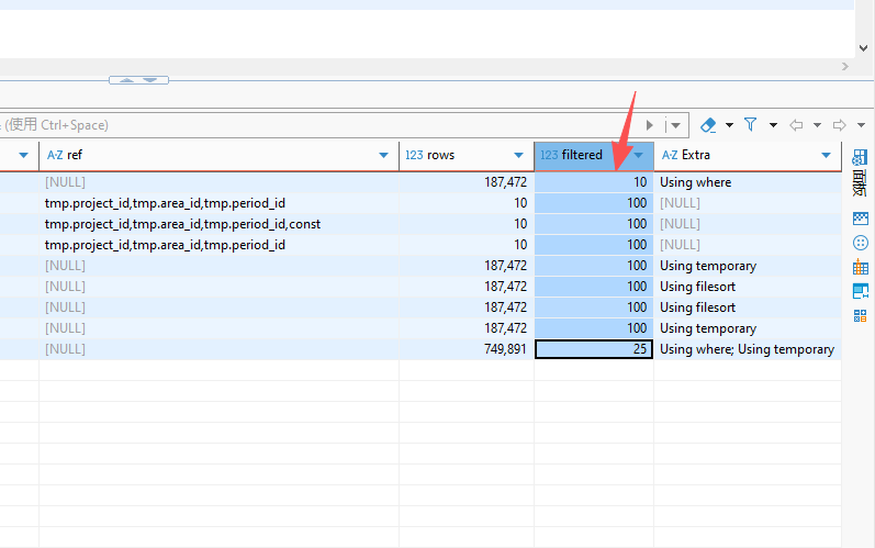(1) Using index:仅查询索引树就可以获取到所需要的数据行,而不需要读取表中实际的数据行。通常适用于select字段就是查询使用索引的一部分,即使用了覆盖索引。 (2) Using index condition:显示采用了Index Condition Pushdown (ICP)特性通过索引去表中获取数据。 (3) Using index for group-by:跟Using index访问表的方式类似,显示MySQL通过索引就可以完成对GROUP BY或DISTINCT字段的查询,而无需再访问表中的数据。 (4) Using where:显示MySQL通过索引条件定位之后还需要返回表中获得所需要的数据。 (5) Impossible WHERE:where子句的条件永远都不可能为真。 (6) Using join buffer (Block Nested Loop), Using join buffer (Batched Key Access):在表联接过程当中,将先前表的部分数据读取到join buffer缓冲区中,然后从缓冲区中读取数据与当前表进行连接。主要有两种算法:Block Nested Loop和Batched Key Access (7) Using MRR:读取数据采用多范围读(Multi-Range Read)的优化策略。 (8) Range checked for each record (index map: N):MySQL在获取数据时发现在没有索引可用,但当获取部分先前表字段值时发现可以采用当前表某些索引来获取数据。 (9) Using temporary:MySQL需要创建临时表来存放查询结果集。通常发生在有GROUP BY或ORDER BY子句的语句当中。 (10) Using filesort:MySQL需要对获取的数据进行额外的一次排序操作,无法通过索引的排序完成。通常发生在有ORDER BY子句的语句当中。