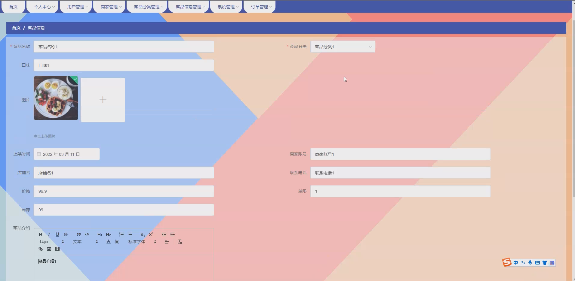 菜品信息模块:实现商家发布菜品信息、更新菜品价格与库存、上传菜品图片,用户浏览菜品详情等功能。
