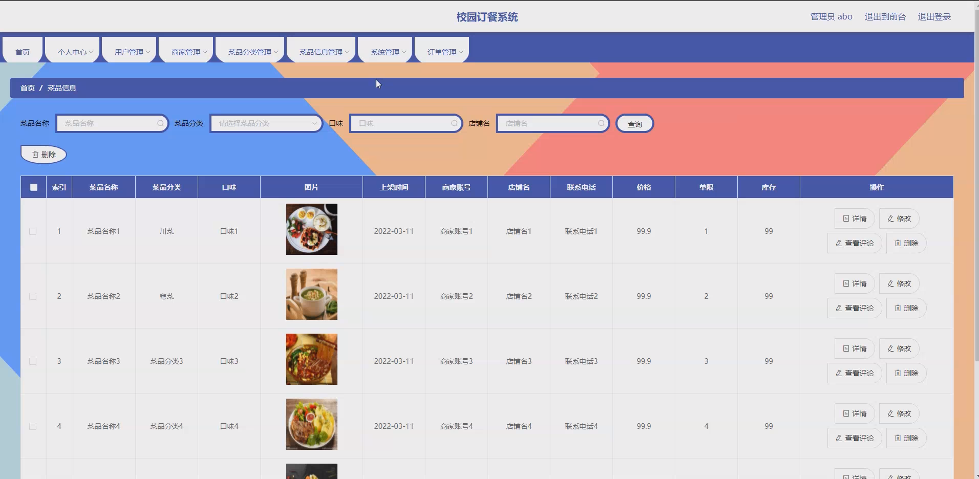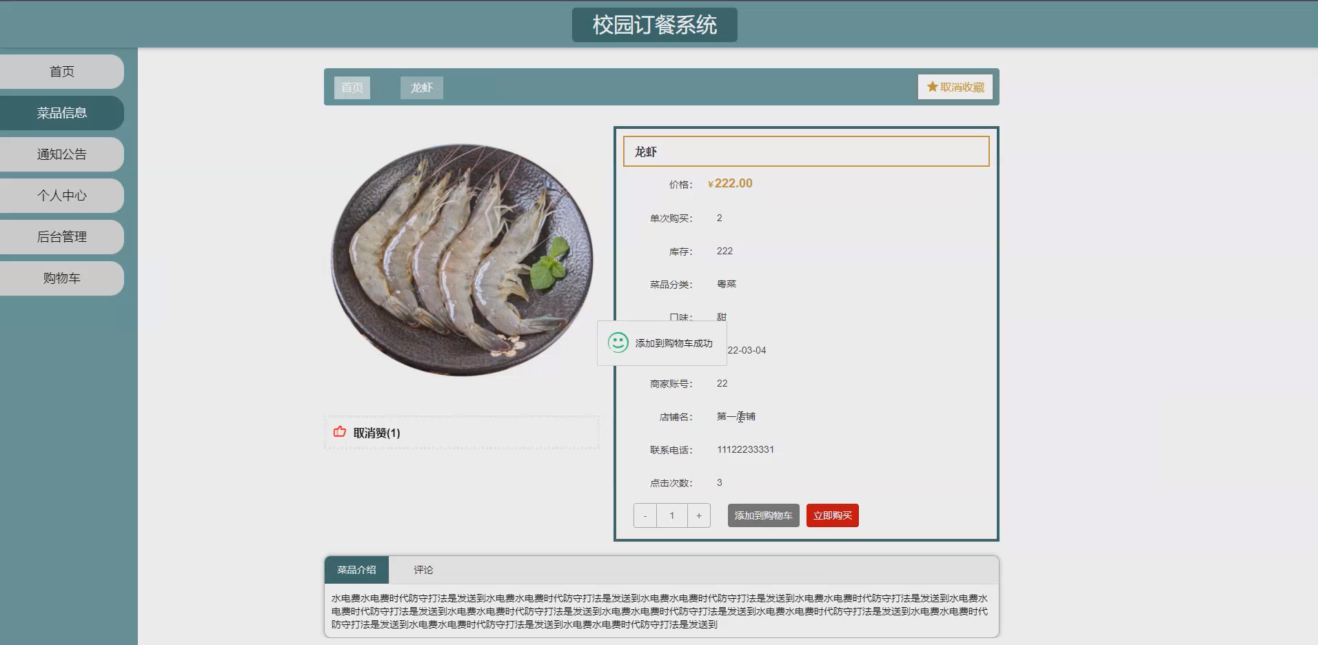 对师生用户而言,系统提供了便捷的线上订餐渠道,可通过菜品分类快速筛选心仪菜品,直观查看菜品详情,节省排队与订餐时间;对商家而言,实现了菜品信息的规范化管理与精准展示,便于及时更新菜品信息、对接用户需求,提升经营效率;对高校而言,系统可辅助规范校园餐饮服务流程,优化餐饮资源配置,提升校园服务的智能化水平。