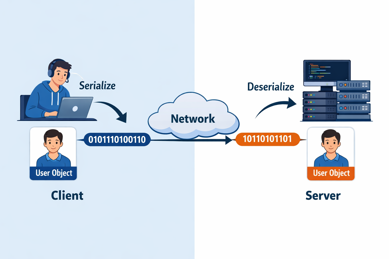 - 客户端与服务器之间的数据传输: 在分布式系统中,客户端和服务器之间需要通过网络传输数据。如果传输的是对象,那么对象必须先序列化为字节流,才能通过网络发送。接收端收到数据后再反序列化还原为对象。