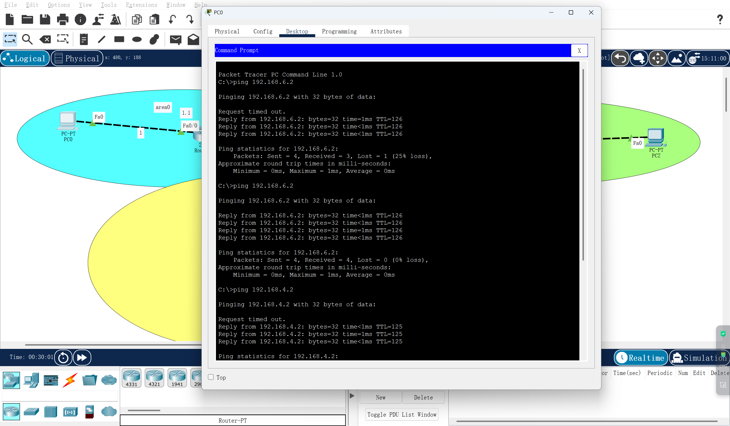 配置完成后,使用PC0ping其余两台PC的地址,能够ping通,配置成功