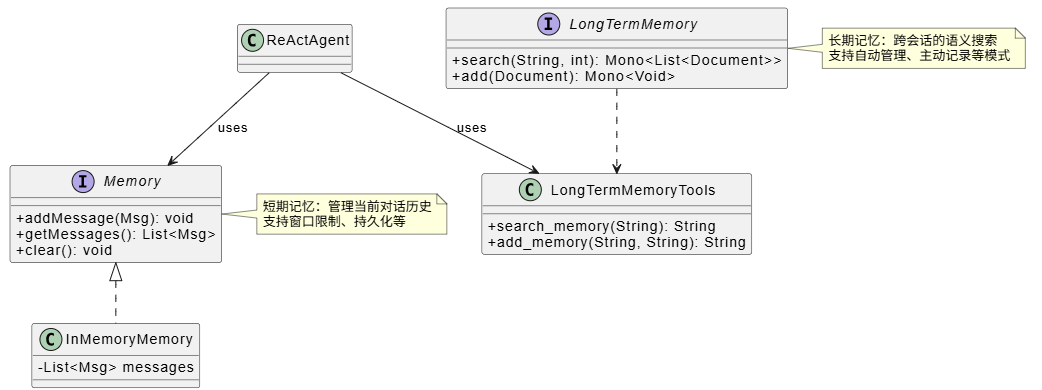 短期记忆 :InMemoryMemory 是最简单的实现,它将消息存储在内存中的 List<Msg> 中。每次调用智能体时,用户消息和智能体回复都会被添加到记忆中,形成完整的对话历史。