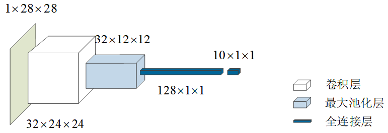PyTorch的线性层Linear需要显式设置输入参数个数,来看一下第一个Linear的输入参数个数是如何计算的。在卷积层中,每个卷积核将输入的 1×28×281 \times 28 \times 281×28×28 格式的数据转换成了 1×24×241 \times 24 \times 241×24×24格式的数据,因为有 323232 个卷积核,因此该卷积层的最终输出数据格式为 32×24×2432 \times 24 \times 2432×24×24。再经过一个核为 2×22 \times 22×2 的池化层,输出数据格式为 32×12×1232 \times 12 \times 1232×12×12。因此,它就是第一个Linear算子的输入参数。