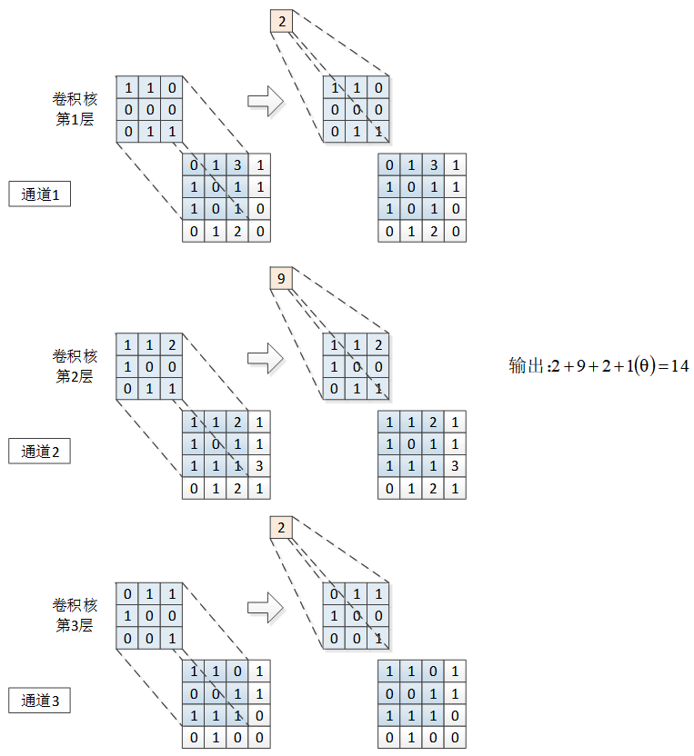 如果数据是多通道的,则卷积核也分为多层,每一层对应一个通道,各层参数不同。每层卷积核的操作与单通道上的卷积操作相同,最终输出是每层输出的和再加上阈值,如图12-2所示。因此,无论输入的张量有多少个通道,经过一个卷积核后的输出都是单层的。