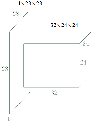 在卷积运算中,一般会设置多个卷积核。代码 12-1 所示的示例中设置了 323232 个卷积核,每个卷积核输出一层,因此该卷积层的输出是 323232 层的,也就是说将 1×28×281 \times 28 \times 281×28×28 的数据变成了 32×24×2432 \times 24 \times 2432×24×24 的。在画神经网络结构图时,一般用图 12-3 中的长方体来表示上述卷积运算,水平方向长度示意卷积核的数量。