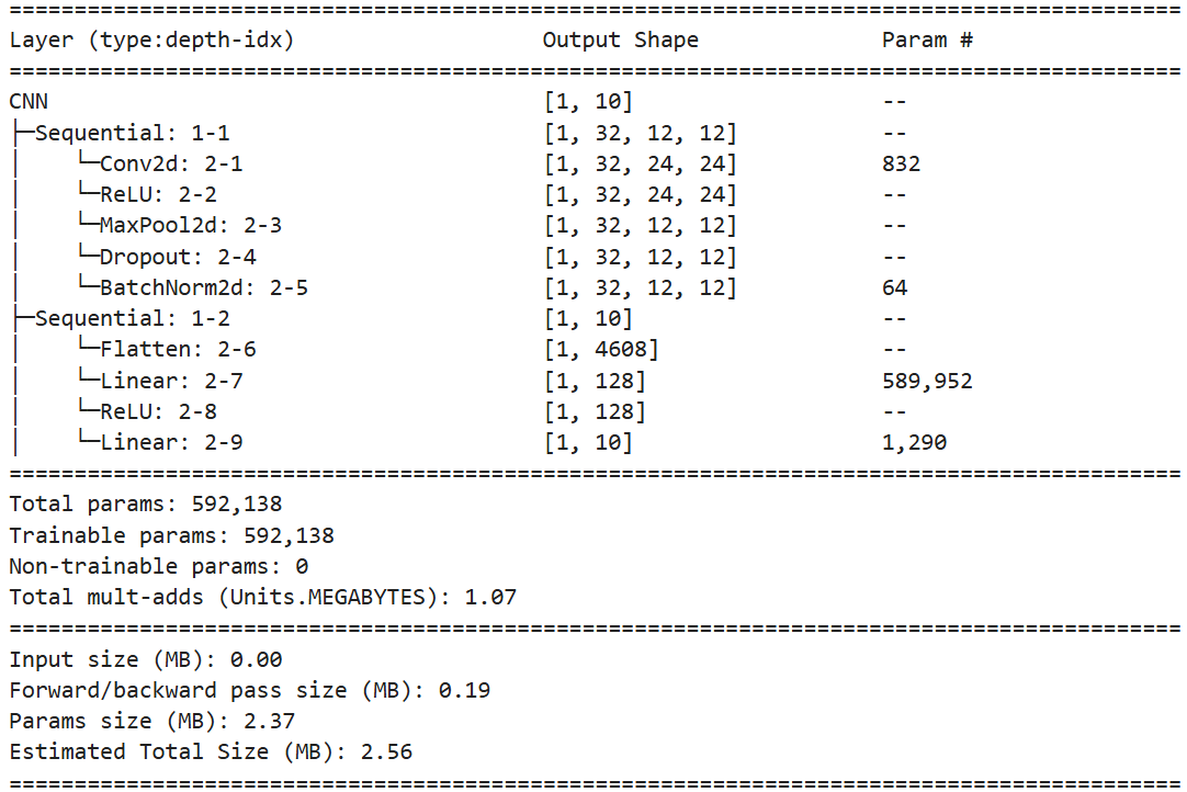 pythonimport torch import torch.nn as nn import torch.optim as optim from torchvision import datasets, transforms from torch.utils.data import DataLoader import datetime from torchinfo import summary # 数据预处理和加载 transform = transforms.Compose([ transforms.ToTensor(), #transforms.Normalize((0.1307,), (0.3081,)) ]) train_dataset = datasets.MNIST('../data', train=True, download=True, transform=transform) test_dataset = datasets.MNIST('../data', train=False, transform=transform) print(train_dataset[0][0].shape) train_loader = DataLoader(train_dataset, batch_size=200, shuffle=True) test_loader = DataLoader(test_dataset, batch_size=200) # 定义CNN模型 class CNN(nn.Module): def __init__(self): super().__init__() self.features = nn.Sequential( nn.Conv2d(in_channels=1, out_channels=32, kernel_size=5), nn.ReLU(), nn.MaxPool2d(2), nn.Dropout(0.2), nn.BatchNorm2d(32) ) self.classifier = nn.Sequential( nn.Flatten(), nn.Linear(32*12*12, 128), nn.ReLU(), nn.Linear(128, 10) ) def forward(self, x): x = self.features(x) return self.classifier(x) model = CNN() print("模型结构:") summary(model, input_size=(1, 1, 28, 28))输出: