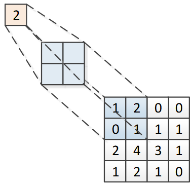 池化操作也叫下采样(sub-sampling),具体过程与卷积层基本相同,只不过池化层的卷积核只取对应位置的最大值或平均值,分别称为最大池化或平均池化。最大池化操作如图 12-5所示,将对应位置中的最大值输出,结果为2。如果是平均池化,则将对应位置中的所有值求平均值,得到输出1。池化层没有需要训练的参数。