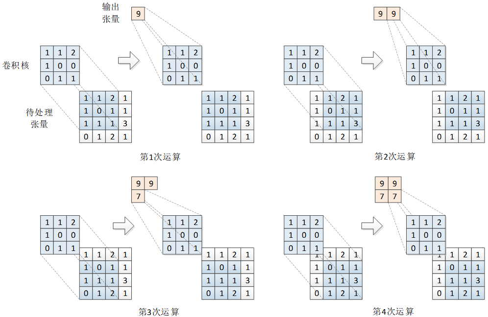 卷积核已经到达待处理张量的最右侧和最下侧,卷积运算结束。每次输出的结果也按移动位置排列,得到输出张量S=[9977]S = \begin{bmatrix} 9 & 9 \\ 7 & 7 \end{bmatrix}S=[9797]