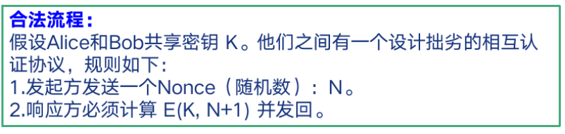 N_A=114514后会以为这是Bob向他发起了新的挑战,于是返回E(K,N_A+1) E(K,N_A+1)被Eve截获,Eve再将E(K,N_A+1)发送给Alice,于是Alice认证Eve通过