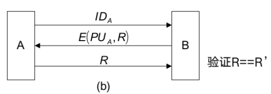 E(PU_A,R)后,使用自己的私钥PR_A解密后,将得到的原文R'发给验证者B - 验证者B去验证R'==R是否成立,若成立,则可以证明A的身份