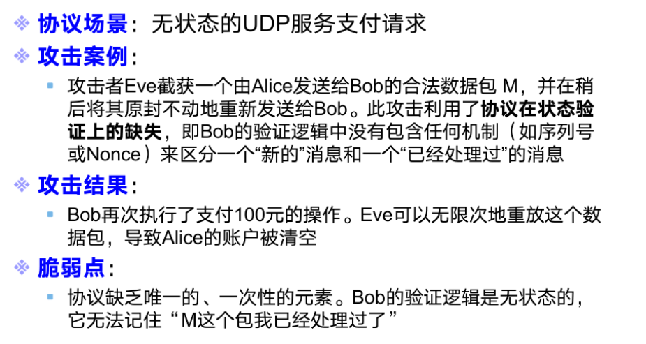 - Eve将截获的Alice的认证包重放,则Bob验证Eve通过