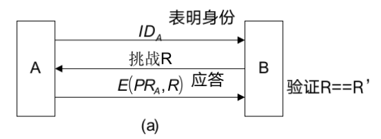 - 挑战:即要求对方证明自己拥有相应的身份标识;验证方B向待认证方A发送一个挑战(可以是随机的一次性字符串/随机数等)