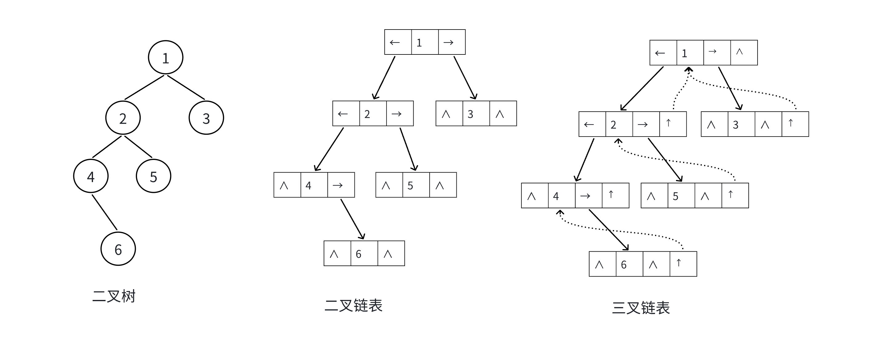 用链表表示二叉树通常的方法是每个链表节点中有三个作用域组成,分别是左右指针域和数据域,左右指针域存储的是该结点的左右孩子的地址,数据域是该节点存储的数据,这就是我们现在要学习的二叉链表。在二叉树的链式表示中,分为刚刚讲的二叉链表,还有三叉链表,这会在c++课程中详解讲解,大家敬请期待哈.三叉链表就是指针域有三个指针,除去指向左右孩子的指针外,还多出一个指向父结点的指针,这一般会在红黑树等高阶数据结构中会使用到,下面是这两种链表的结构图: