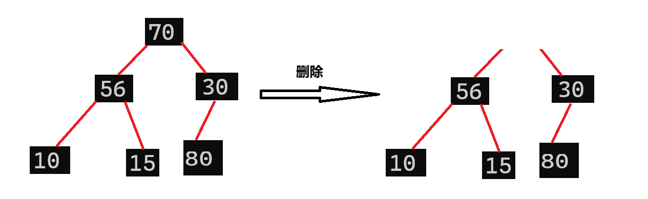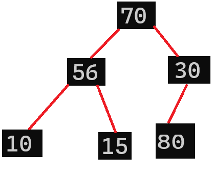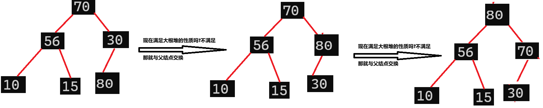但是通过观察,我们这棵二叉树本应该是大根堆的二叉树,在加入80之后,就破坏了这棵二叉树原有的性质了,想要让它重新回到大根堆的性质我们该怎么办?那就是移动80这个元素,移动到这棵二叉树重新回到大根堆的性质为止.