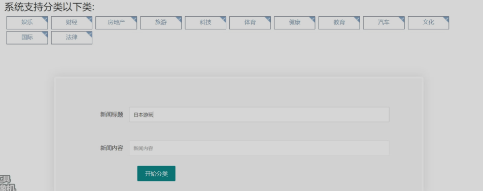 新闻分类模块是此次所开发的系统中最为主要的使用功能,这个功能的使用中,需要通过展示新闻分类的具体类别,通过输入新闻的标题以及输入新闻的具体内容来进行新闻分类。新闻分类的整个模块中有文本框的显示,在文本框中输入完信息内容之后,点击开始分类,系统将会自动对输入内容进行分类。